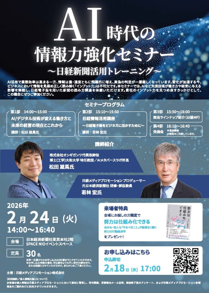 2026年2月24日(火)、オンギガンツ代表の松田雄馬が「AI時代の情報力強化セミナー ~日経新聞活用トレーニング~(主催:日経メディアプロモーション株式会社)」に登壇いたします。